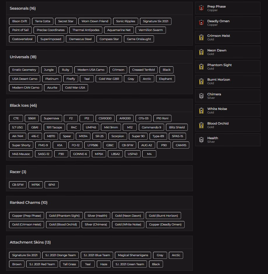 214 LVL - 16X SEASONALS - 46X BLACK ICES - 18X UNIVERSALS - 17X ELITES - 3X RACER - 73 OPERATORS - 4K RENOWN FA