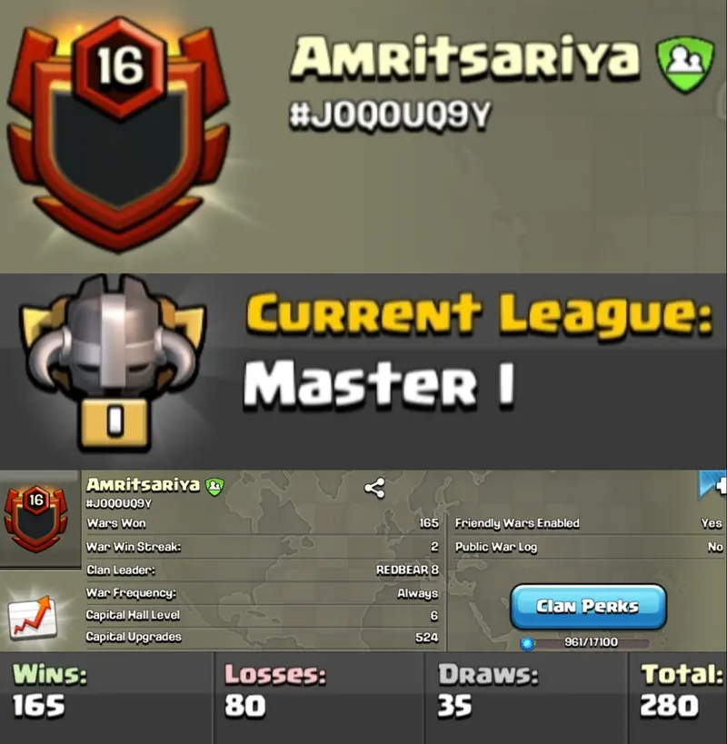 Level 16 clan || clan capital 6 || master 1 || warlog 165-80 || name - Amritsariya