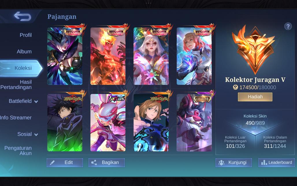 Account Skin 490, 4 Skin Legend, 4 Collector, NEO Lylia, SAIYA GOLD Valir, 2 JJK, 2 KOF, 2 CLOUDS, 2 ASPI, RECALL EPIC