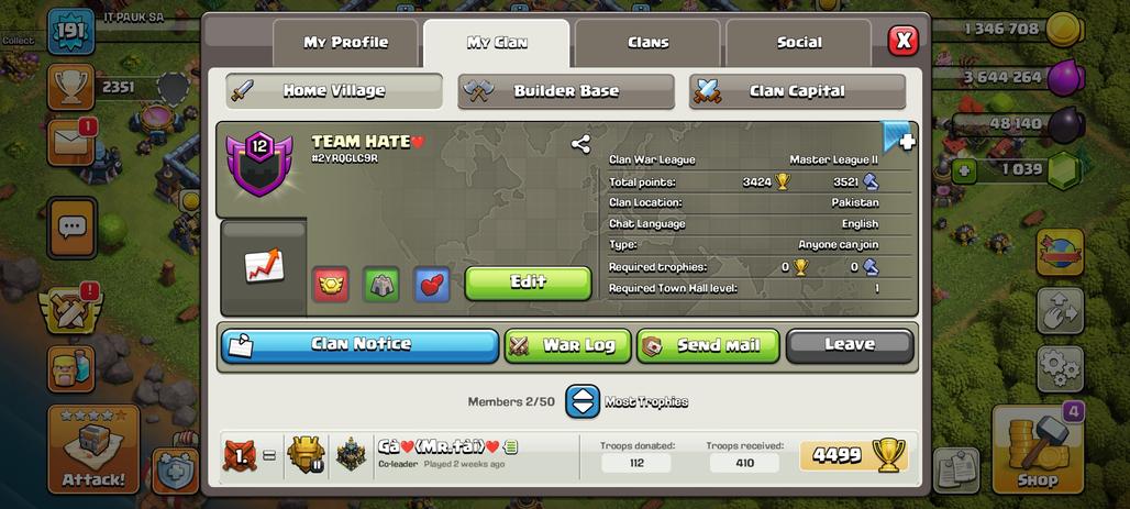 🌟CLAN NAME [ TEAM HATE] 🌟| CLAN LEAGUE MASTER 2 | CLAN LEVEL 12.8 | WAR LOG 11 WIN 12 LOSS | CLAN CAPITAL 6