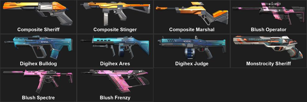 Composite Sheriff, Composite Stinger, Composite Marshal, Blush Operator, Digihex Bulldog, Digihex Ares, Digihex Judge, Monstrocity Sheriff, Blush Spectre, Blush Frenzy 📦 Total Skins: 10 💎 Inventory Value: 0 VP