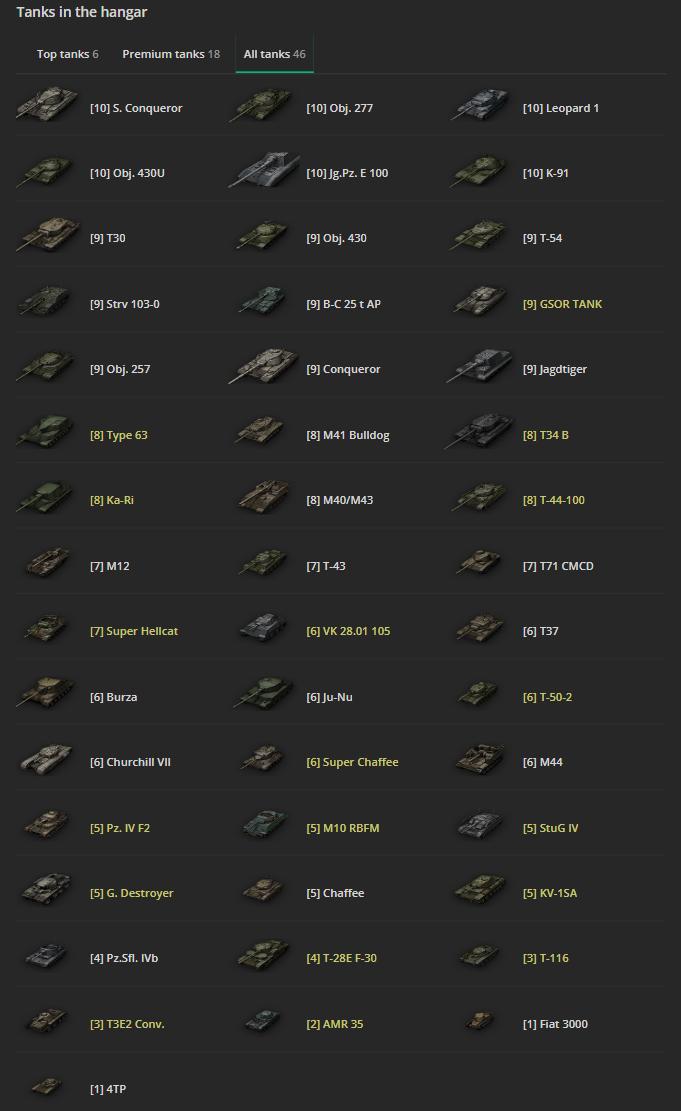 [EU] 6 TIER X | 18 PREMIUM TANK | TOTAL TANKS 46 | 6418 (50) WINS | 130.90.100 CREDITS | GOLD 331 |