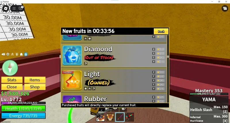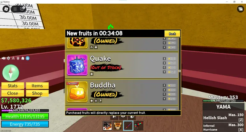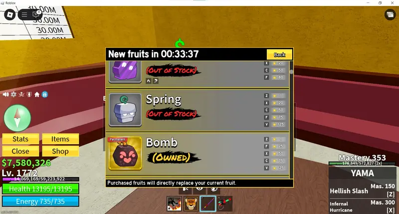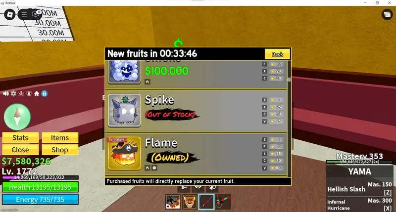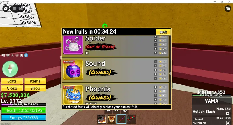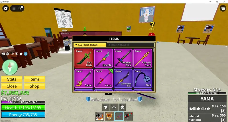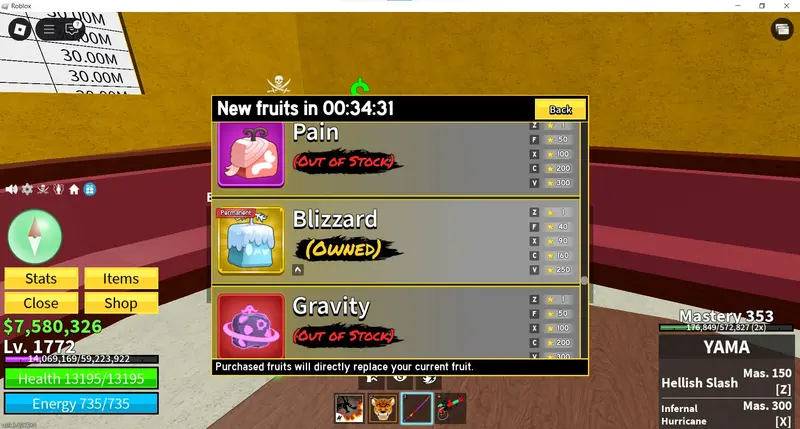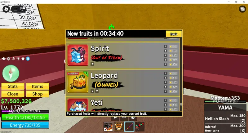In Blox Fruits, you'll find a large collection of expensive permanent fruits such as Blizzard, Phoenix, Sound, Light, Flame, Buddha, Leopard, Bomb, and Spirit, along with Dark Blade and other rare swords like Bisento, Midnight Blade, Pole (1st form), Saber, Yama, Dual-Headed Blade, and Flail.